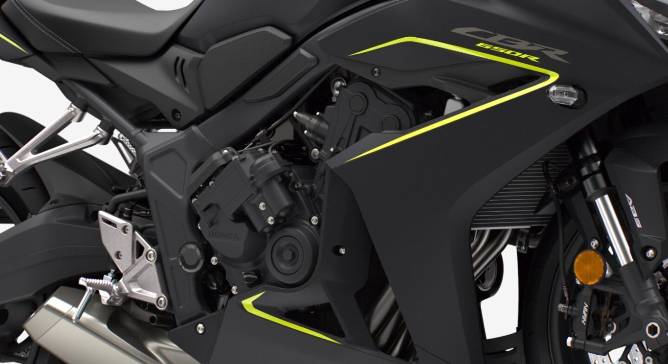 The CBR650R’s liquid-cooled 649 cc four-cylinder engine uses a compact internal architecture with cylinders canted forward 30 degrees for a lower centre of gravity and an impressive power-to-weight ratio.