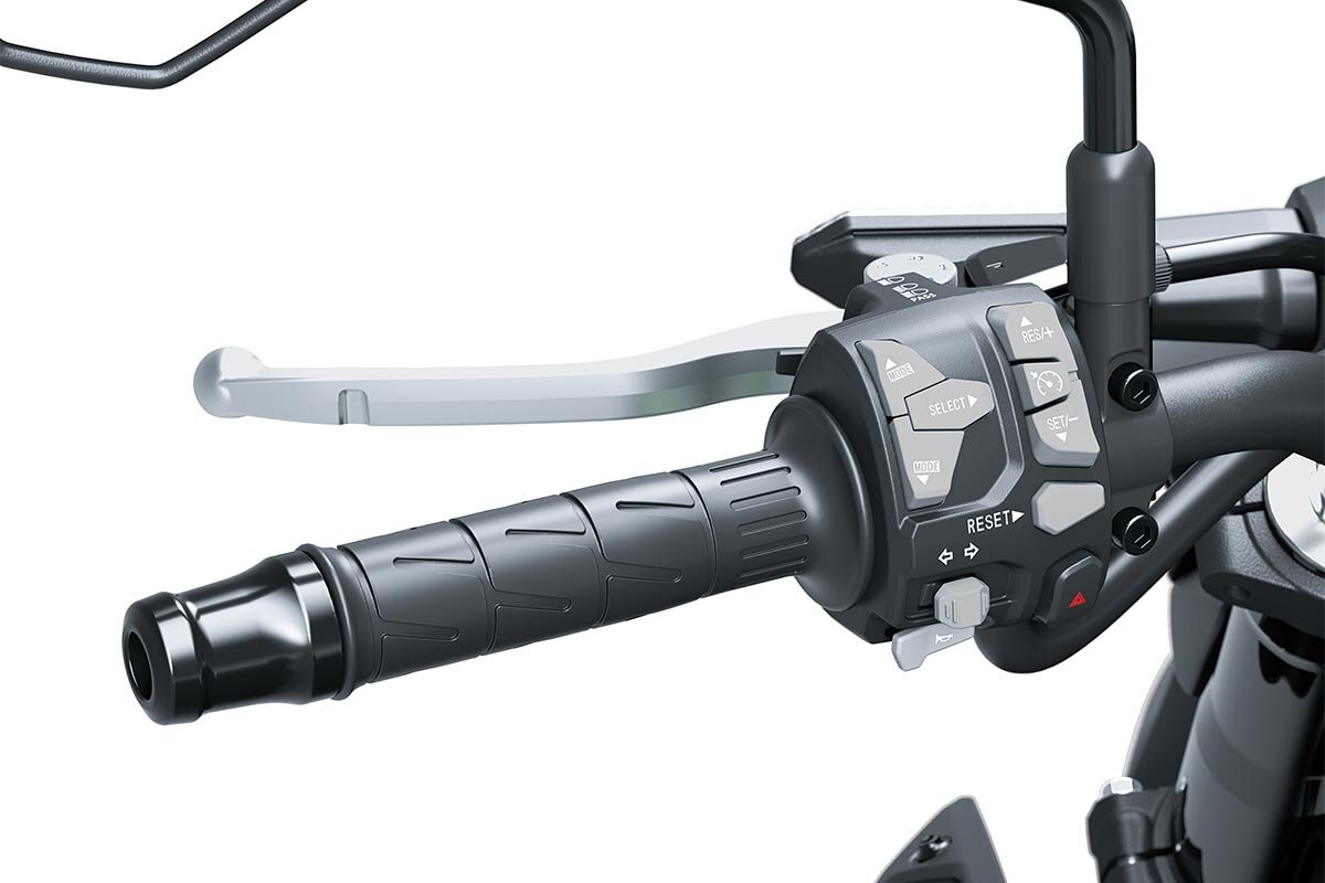 Full-colour TFT screen with digital speedometer, digital tachometer, gear position indicator, shift lamp, fuel gauge, odometer, dual trip meters, current and average fuel consumption, remaining range, average speed, total time, coolant temperature, clock, battery voltage, KQS, Electric Cruise Control, Kawasaki service reminder, oil change reminder, Riding Mode indicator, smartphone call and mail notices, smartphone battery level, headset, voice command status and riding log status indicators, RIDEOLOGY THE APP indicator, Economical Riding Indicator, and turn-by-turn navigation display; and lean angle indicator, acceleration/deceleration indicator, and maximum lean angle (on the Type 2 display)