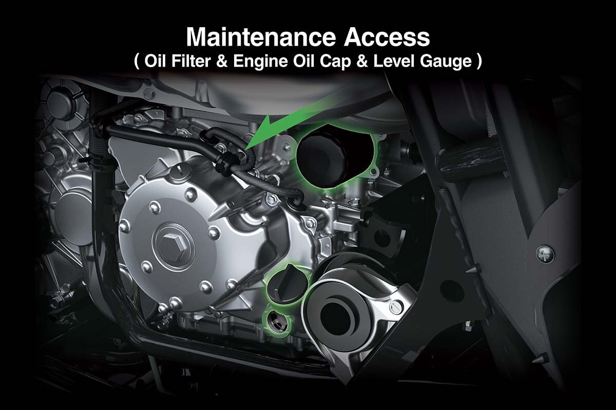 Using high-precision electronic control for engine management, Kawasaki models can achieve a high level of fuel efficiency. However, fuel consumption is greatly affected by throttle use, gear selection, and other elements under the rider's control. The Economical Riding Indicator is a function that indicates when current riding conditions are consuming a low amount of fuel. The system continuously monitors fuel consumption, regardless of vehicle speed, engine speed, throttle position and other riding conditions. When fuel consumption is low for a given speed (i.e. fuel efficiency is high), an "ECO" mark appears on the instrument panel's LCD screen. By riding so that the "ECO" mark remains on, fuel consumption can be reduced.