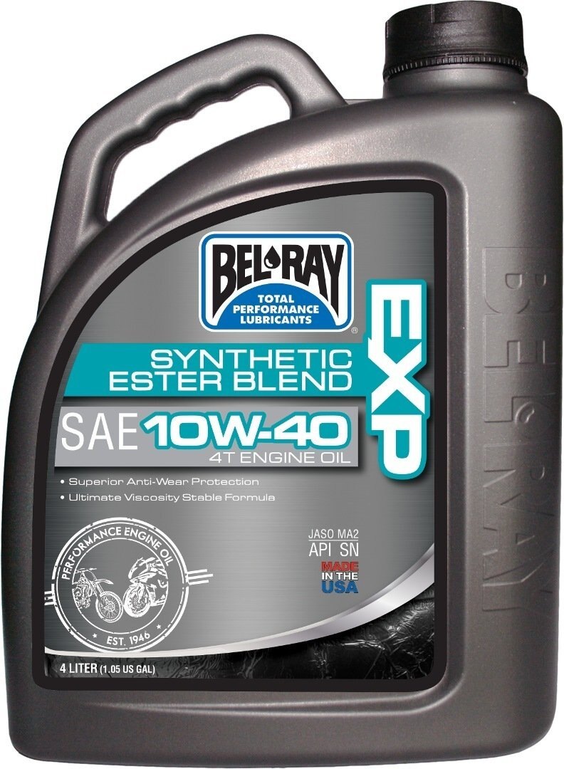 Bel-Ray EXS Full Synthetic Ester 4T Engine Oil is a premium motorcycle oil that uses the finest quality synthetic hydrocarbon and ester base fluids combined with unique Extreme Pressure, anti-wear additives and shear resistant VI improvers to meet the demands of high-performance applications. Lowers engine temperatures and increases horsepower. Meets the performance requirements of API SN and JASO MA2. Suitable for air-cooled/liquid-cooled 4-stroke engines and wet clutches.